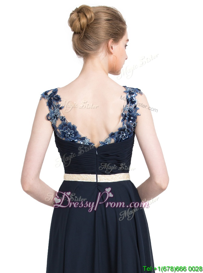 Neckline : V-neckShown Color : Navy BlueSilhouette : EmpireSleeve Length : sleevelessHemline : floor lengthBack Detail : ZipperFabric : ChiffonEmbellishment : BeadingOccasion : Prom,PartySeason : Spring,Summer,Fall,Winter