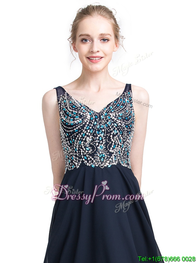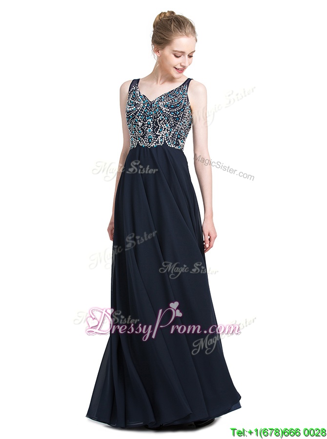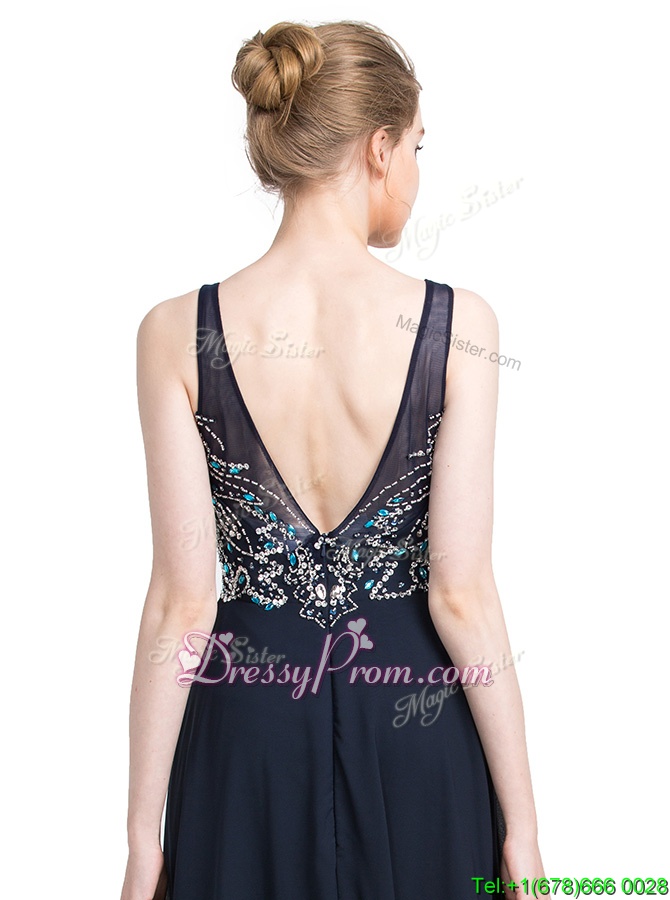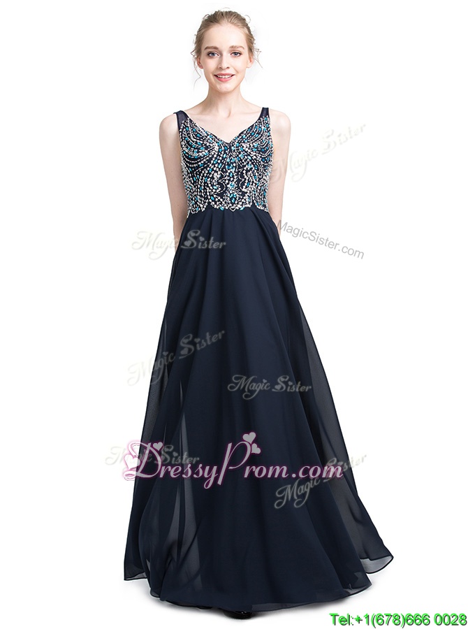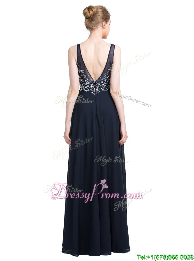 Neckline : V-neckShown Color : BlackSilhouette : Column/SheathSleeve Length : sleevelessHemline : floor lengthBack Detail : ZipperFabric : ChiffonEmbellishment : BeadingOccasion : Prom,PartySeason : Spring,Summer,Fall,Winter