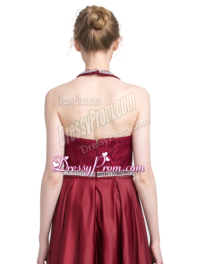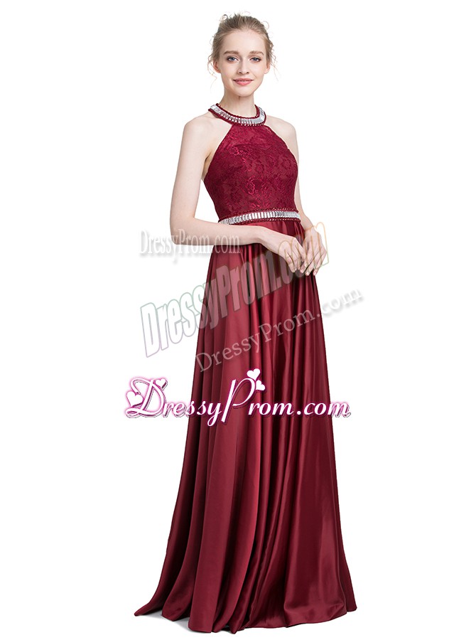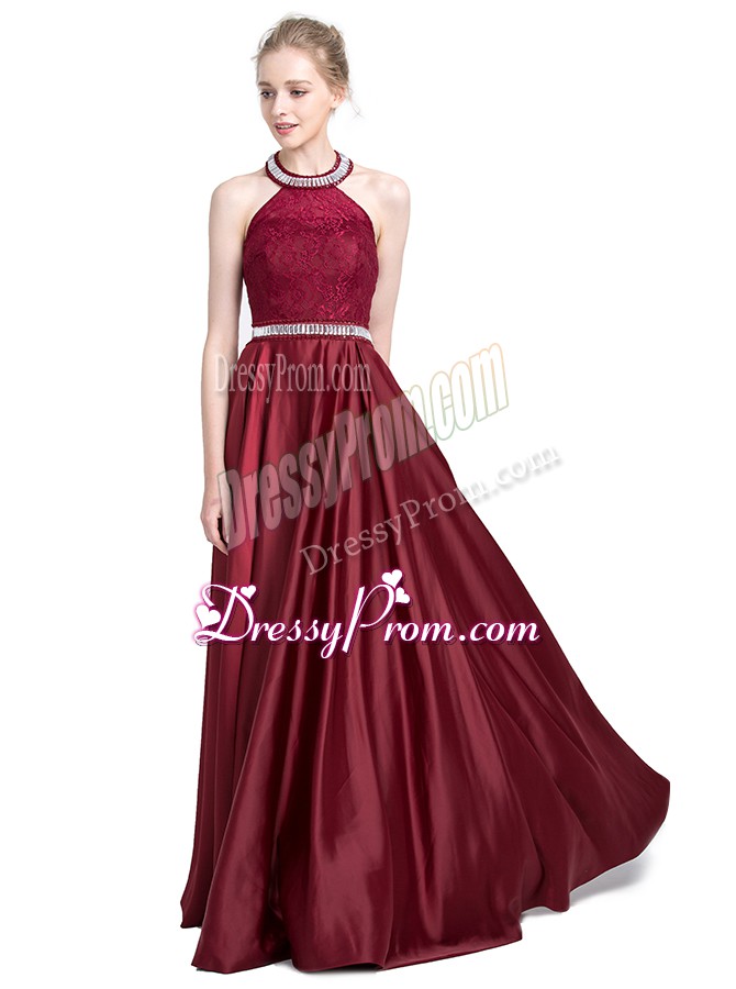 Neckline : Halter topShown Color : BurgundySilhouette : Column/SheathSleeve Length : sleevelessHemline : floor lengthBack Detail : ZipperFabric : TaffetaEmbellishment : Beading,LaceOccasion : Prom,PartySeason : Spring,Summer,Fall,Winter