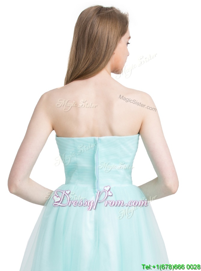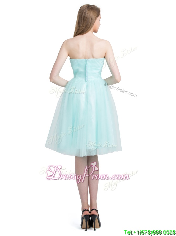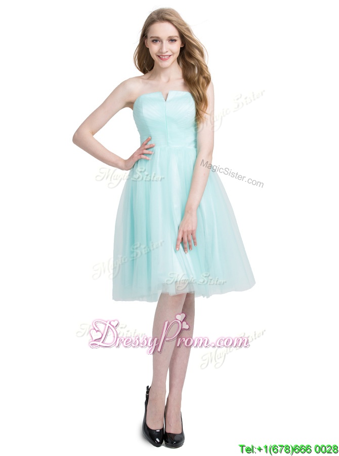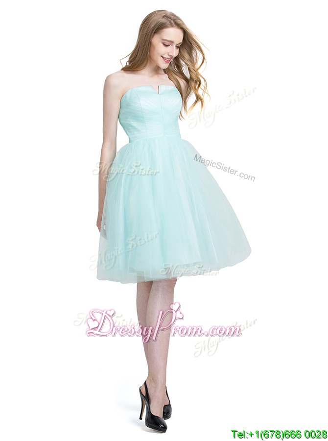 Neckline : StraplessShown Color : TurquoiseSilhouette : A-lineSleeve Length : sleevelessHemline : knee lengthBack Detail : ZipperFabric : TulleEmbellishment : RuchingOccasion : Prom,PartySeason : Spring,Summer,Fall