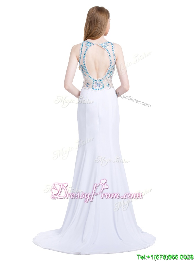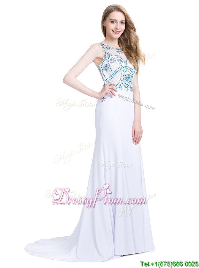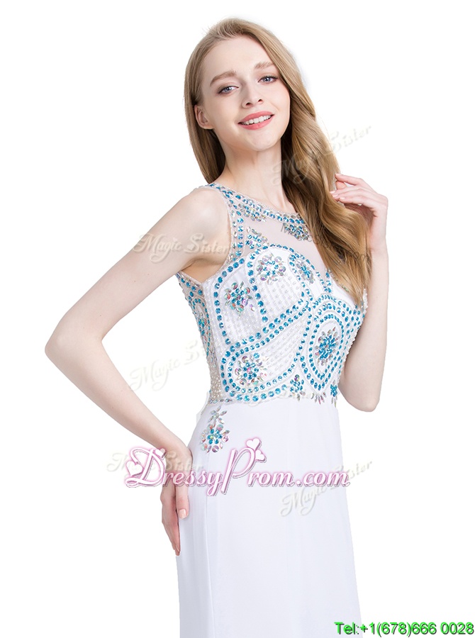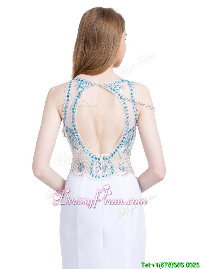 Neckline : ScoopShown Color : WhiteSilhouette : Column/SheathSleeve Length : sleevelessHemline : with trainBack Detail : ZipperFabric : ChiffonEmbellishment : BeadingOccasion : Prom,PartySeason : Spring,Fall,Winter