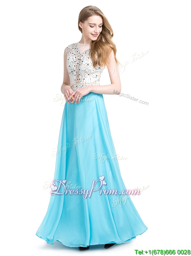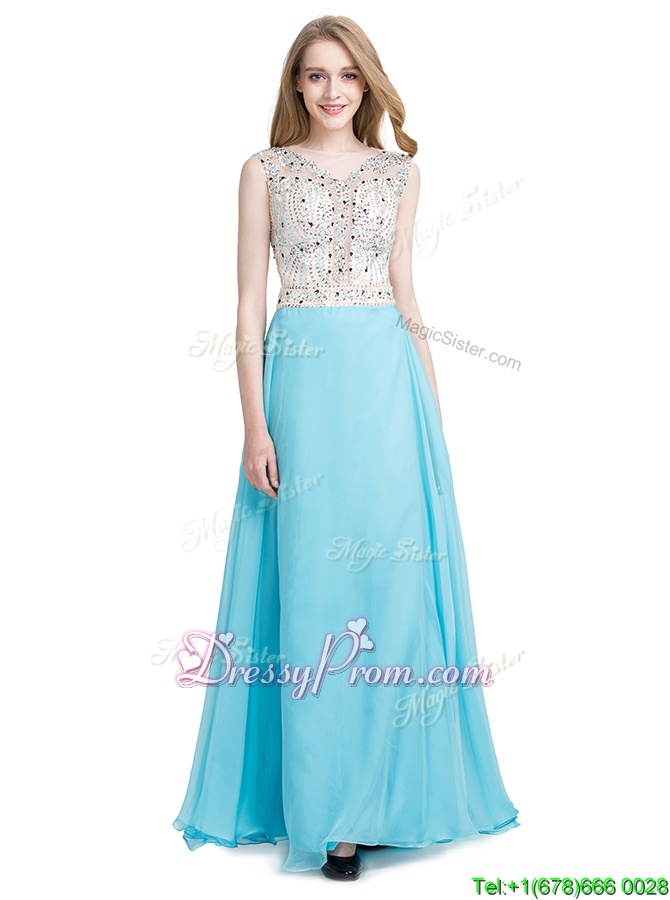 Neckline : ScoopShown Color : Aqua BlueSilhouette : Column/SheathSleeve Length : sleevelessHemline : floor lengthBack Detail : ZipperFabric : ChiffonEmbellishment : BeadingOccasion : Prom,PartySeason : Spring,Summer,Fall,Winter