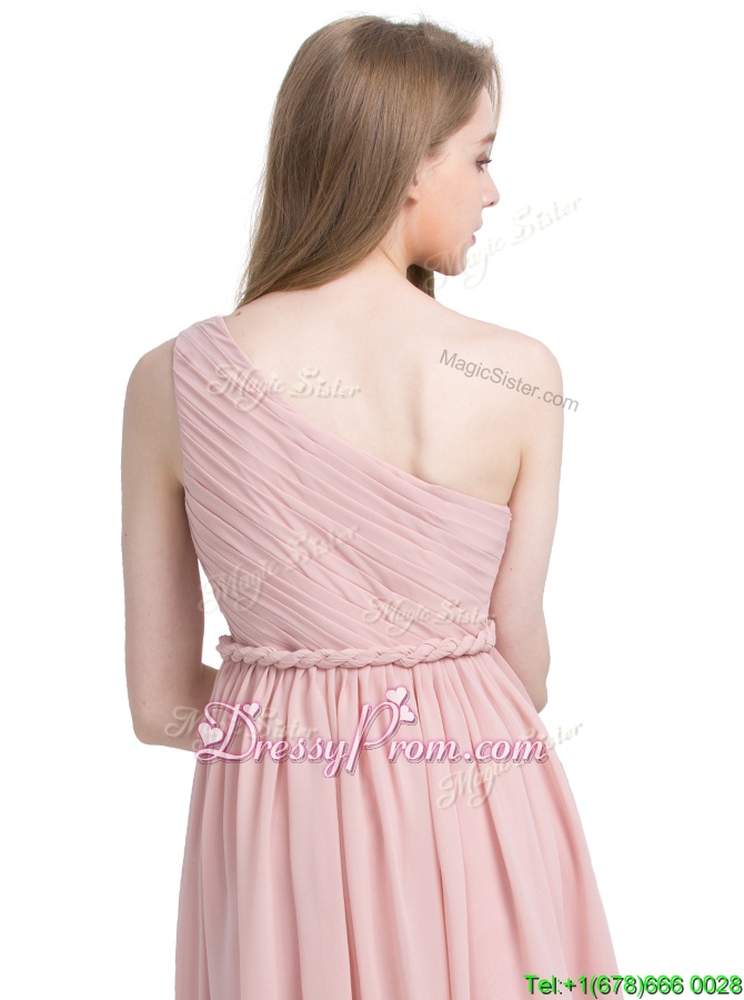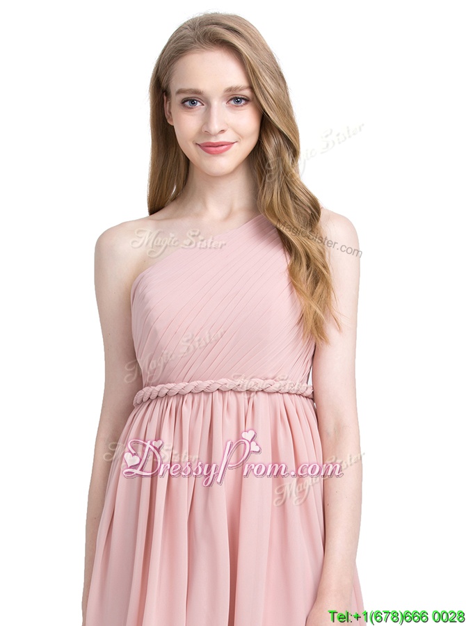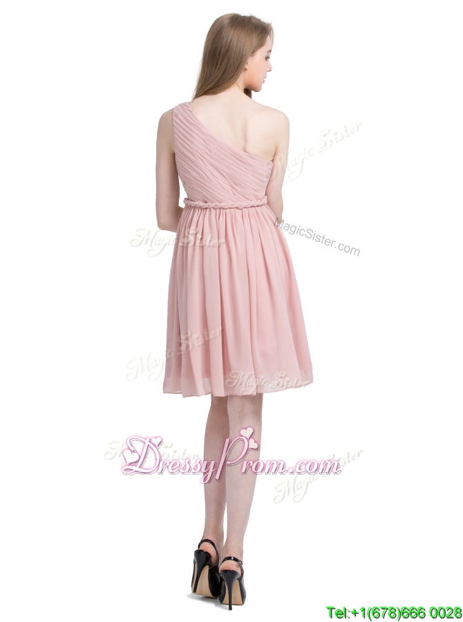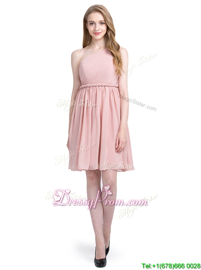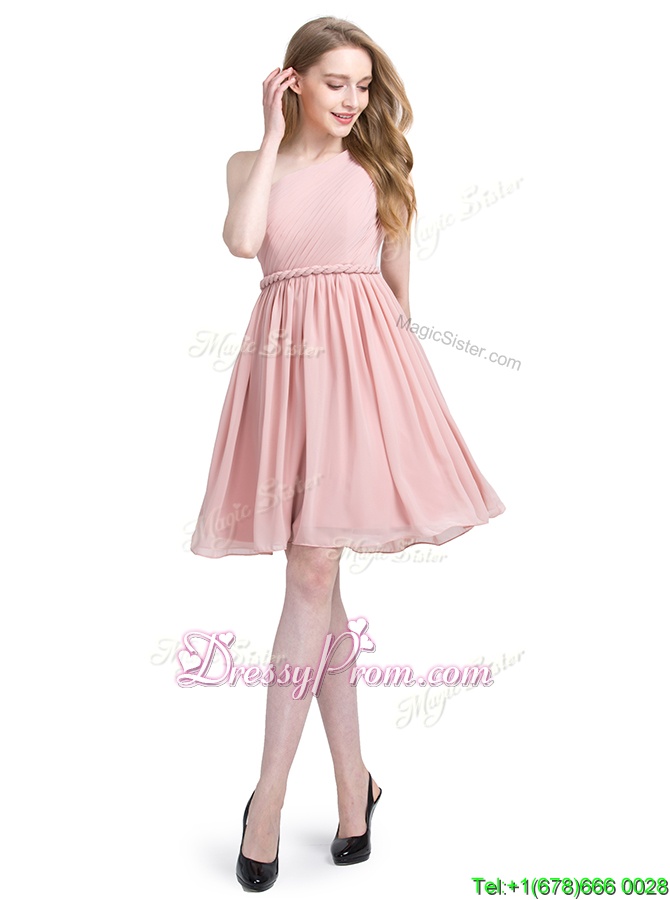Neckline : One shoulderShown Color : PinkSilhouette : Column/SheathSleeve Length : sleevelessHemline : knee lengthBack Detail : Side zipperFabric : ChiffonEmbellishment : RuchingOccasion : Prom,PartySeason : Spring,Summer,Fall