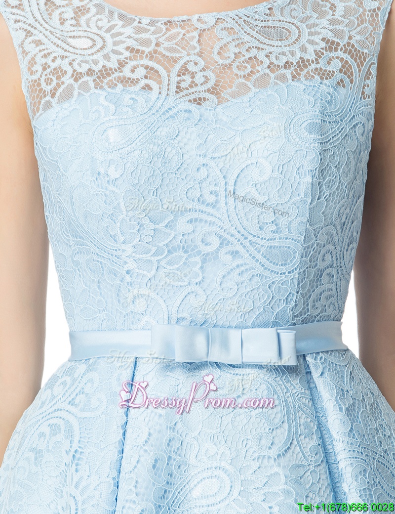 Neckline : ScoopShown Color : Light BlueSilhouette : A-lineSleeve Length : sleevelessHemline : mini lengthBack Detail : ZipperFabric : LaceEmbellishment : Lace,BeltOccasion : Prom,PartySeason : Spring,Summer,Fall,Winter