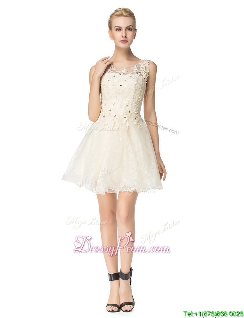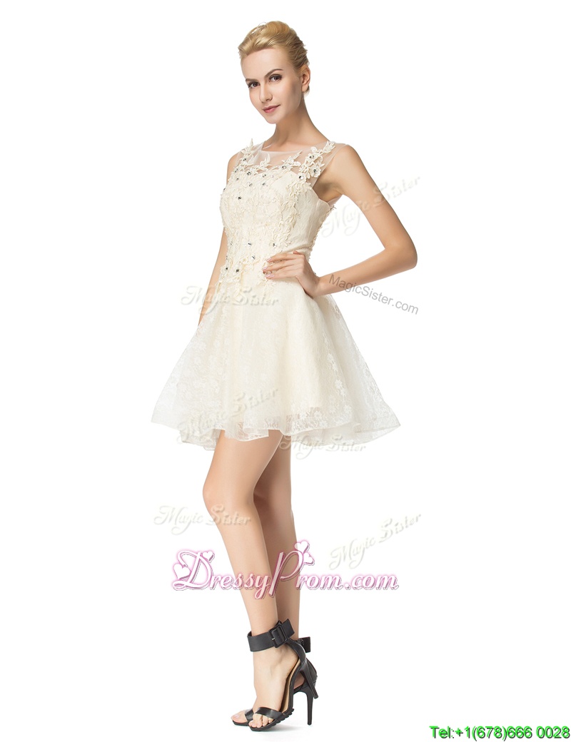 Neckline : ScoopShown Color : ChampagneSilhouette : A-lineSleeve Length : sleevelessHemline : mini lengthBack Detail : Lace upFabric : OrganzaEmbellishment : Beading,AppliquesOccasion : PromSeason : Spring,Summer,Fall