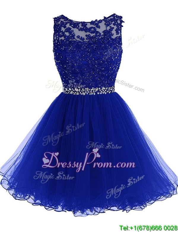 Neckline : ScoopShown Color : Royal BlueSilhouette : A-lineSleeve Length : sleevelessHemline : knee lengthBack Detail : ZipperFabric : ChiffonEmbellishment : Beading,LaceOccasion : Prom,PartySeason : Spring,Summer,Fall