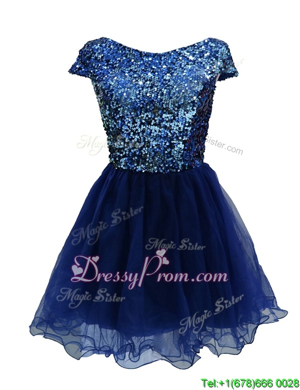 Neckline : BateauShown Color : Navy BlueSilhouette : A-lineSleeve Length : cap sleevesHemline : mini lengthBack Detail : ZipperFabric : ChiffonEmbellishment : SequinsOccasion : Prom,PartySeason : Spring,Summer,Fall
