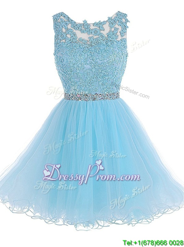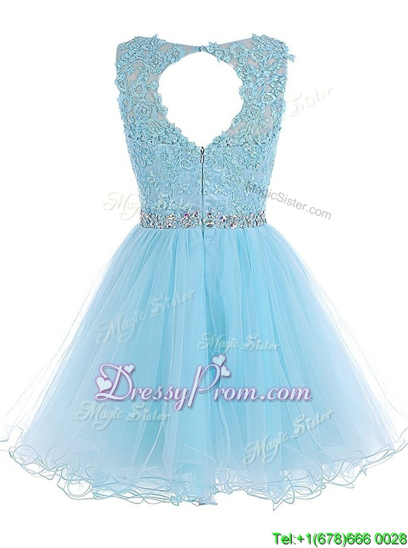 Neckline : ScoopShown Color : Baby BlueSilhouette : A-lineSleeve Length : sleevelessHemline : knee lengthBack Detail : ZipperFabric : ChiffonEmbellishment : Beading,LaceOccasion : Prom,PartySeason : Spring,Summer,Fall