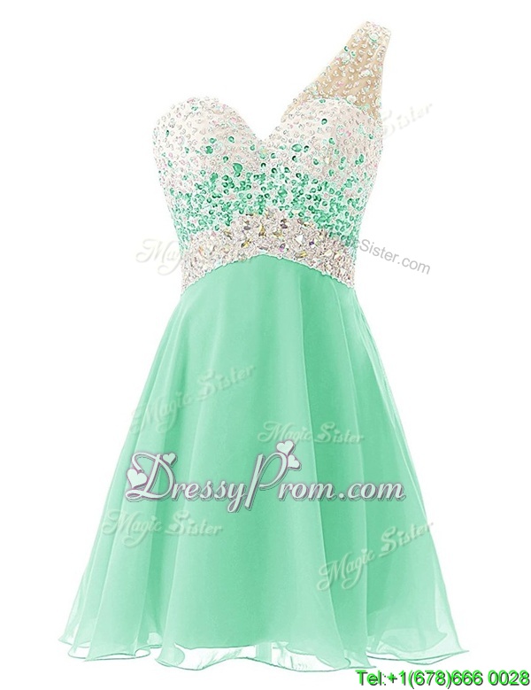 Neckline : One shoulderShown Color : Apple GreenSilhouette : A-lineSleeve Length : sleevelessHemline : knee lengthBack Detail : Criss crossFabric : ChiffonEmbellishment : BeadingOccasion : Prom,PartySeason : Spring,Summer,Fall