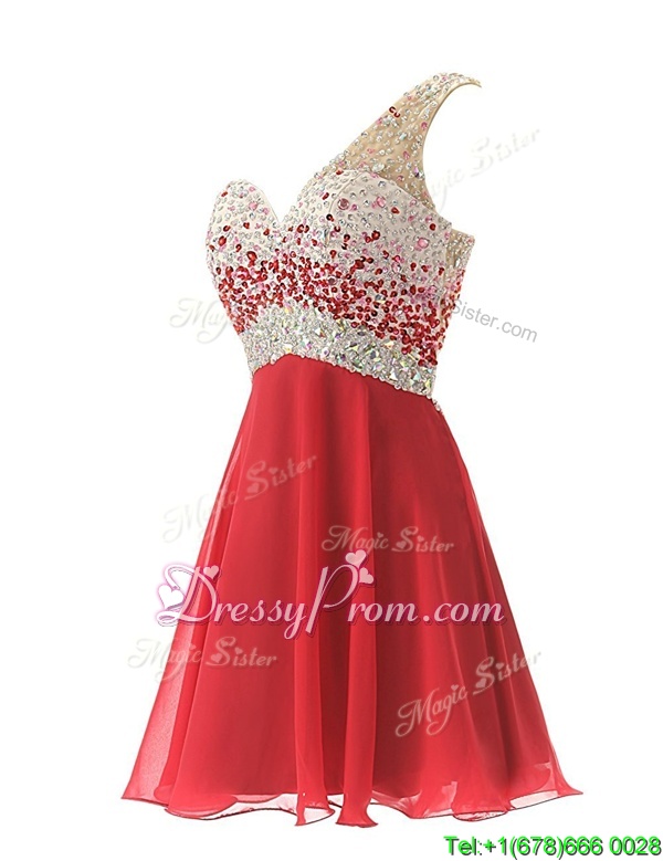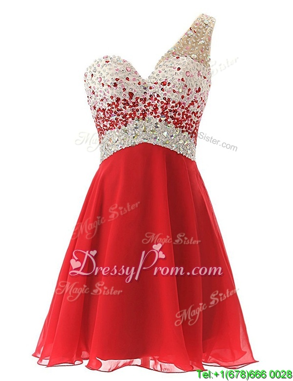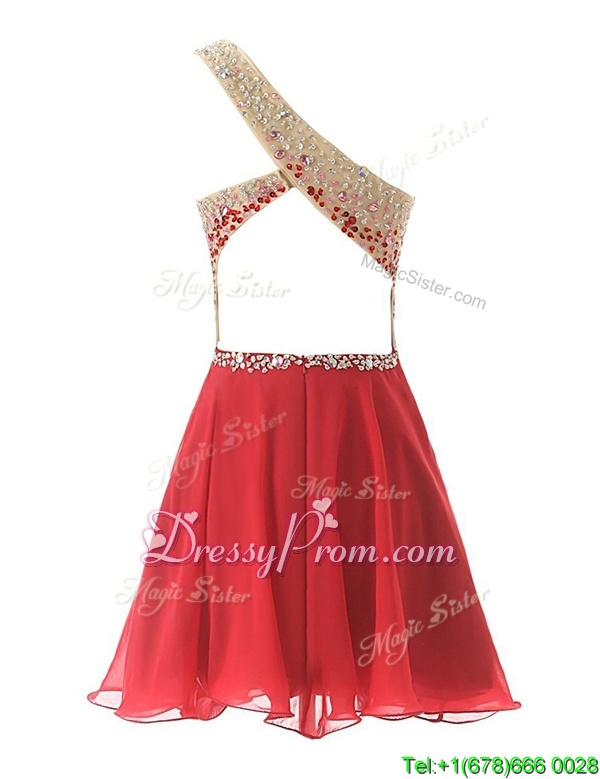 Neckline : One shoulderShown Color : RedSilhouette : A-lineSleeve Length : sleevelessHemline : knee lengthBack Detail : Criss crossFabric : ChiffonEmbellishment : BeadingOccasion : Prom,PartySeason : Spring,Summer,Fall