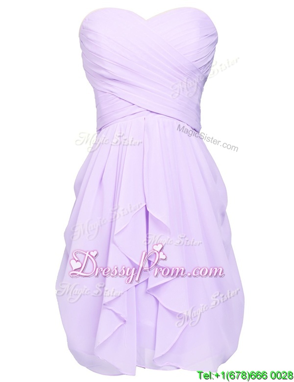 Neckline : SweetheartShown Color : LavenderSilhouette : Column/SheathSleeve Length : sleevelessHemline : knee lengthBack Detail : Lace upFabric : ChiffonEmbellishment : RuchingOccasion : Prom,PartySeason : Spring,Summer,Fall
