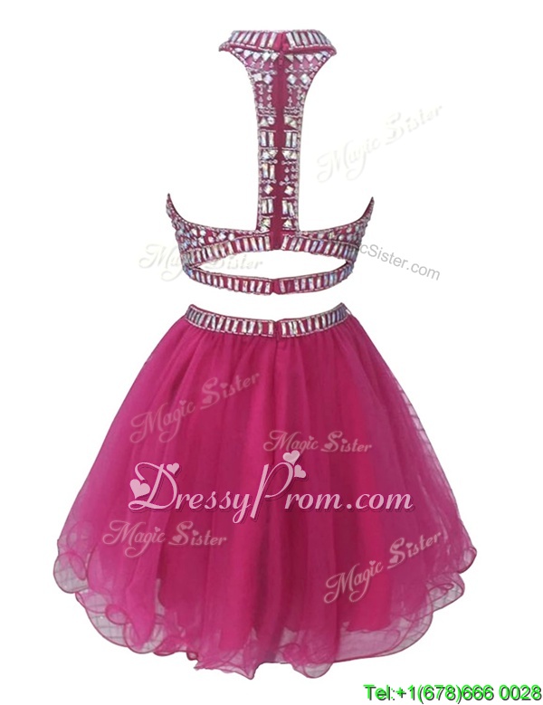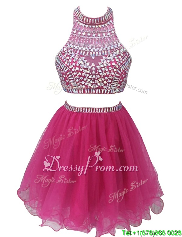 Neckline : High-neckShown Color : FuchsiaSilhouette : EmpireSleeve Length : sleevelessHemline : mini lengthBack Detail : ZipperFabric : ChiffonEmbellishment : BeadingOccasion : Prom,PartySeason : Spring,Summer,Fall