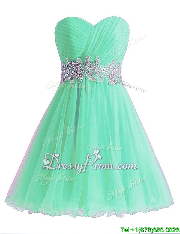 Neckline : SweetheartShown Color : Apple GreenSilhouette : A-lineSleeve Length : sleevelessHemline : knee lengthBack Detail : Lace upFabric : ChiffonEmbellishment : Beading,RuchingOccasion : Prom,PartySeason : Spring,Summer,Fall,Winter