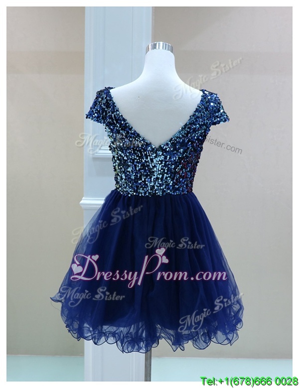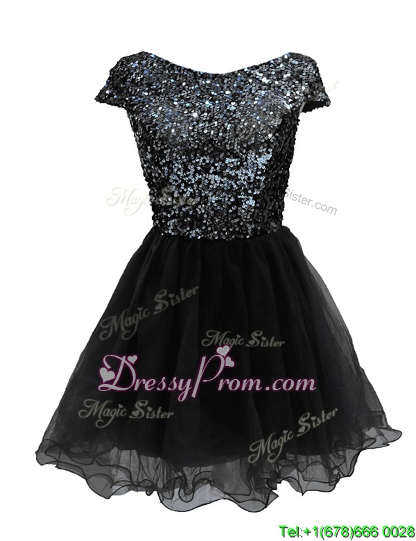 Neckline : BateauShown Color : BlackSilhouette : A-lineSleeve Length : cap sleevesHemline : mini lengthBack Detail : ZipperFabric : ChiffonEmbellishment : SequinsOccasion : Prom,PartySeason : Spring,Summer,Fall