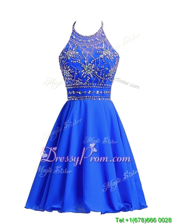 Neckline : Halter topShown Color : Royal BlueSilhouette : A-lineSleeve Length : sleevelessHemline : knee lengthBack Detail : ZipperFabric : ChiffonEmbellishment : BeadingOccasion : Prom,PartySeason : Spring,Summer,Fall