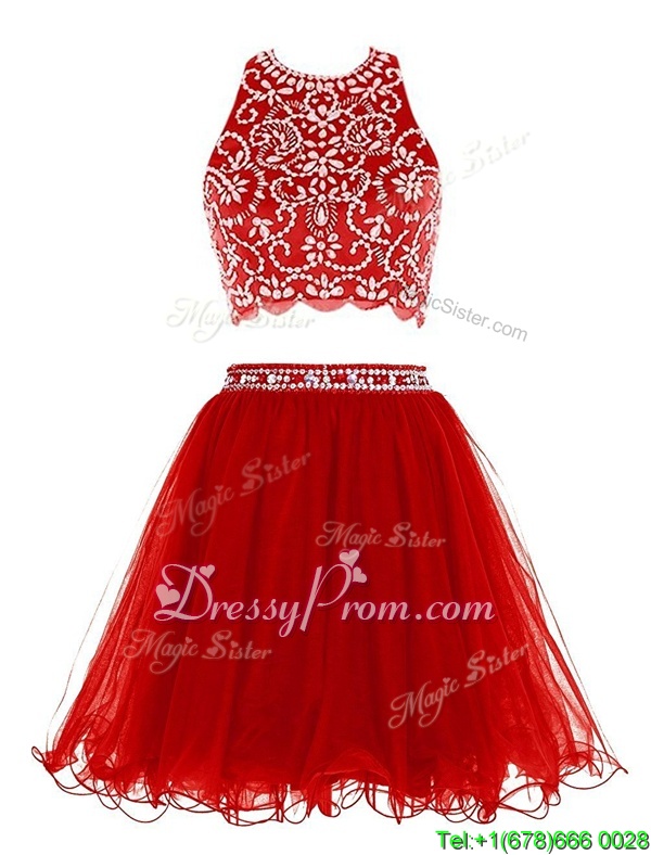 Neckline : ScoopShown Color : RedSilhouette : EmpireSleeve Length : sleevelessHemline : mini lengthBack Detail : Clasp handleFabric : ChiffonEmbellishment : BeadingOccasion : Prom,PartySeason : Spring,Summer,Fall