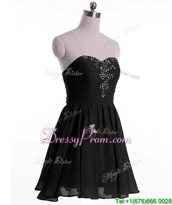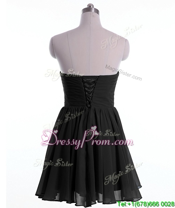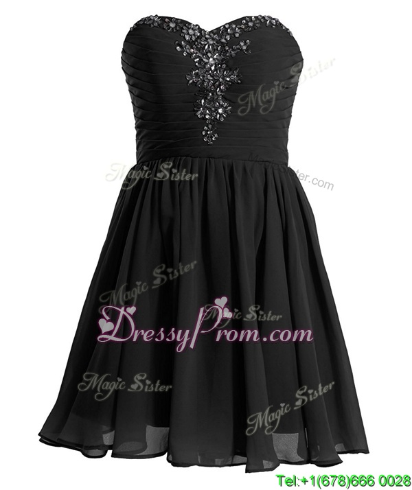 Neckline : SweetheartShown Color : BlackSilhouette : EmpireSleeve Length : sleevelessHemline : mini lengthBack Detail : Lace upFabric : ChiffonEmbellishment : BeadingOccasion : Prom,PartySeason : Spring,Summer,Fall