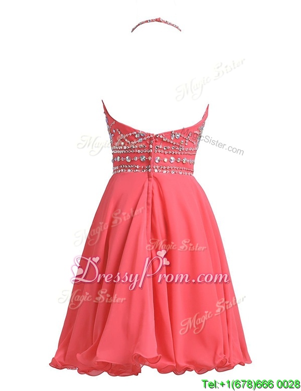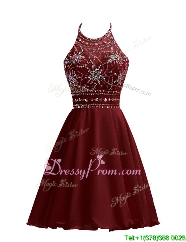 Neckline : Halter topShown Color : BurgundySilhouette : A-lineSleeve Length : sleevelessHemline : knee lengthBack Detail : ZipperFabric : ChiffonEmbellishment : BeadingOccasion : Prom,PartySeason : Spring,Summer,Fall