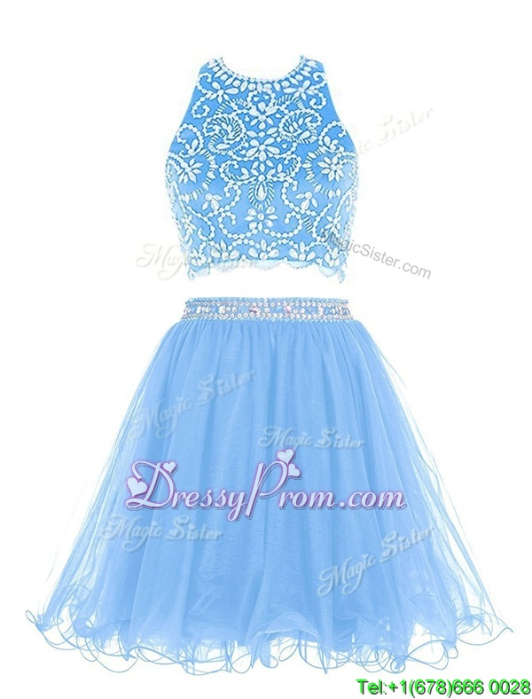 Neckline : ScoopShown Color : BlueSilhouette : EmpireSleeve Length : sleevelessHemline : mini lengthBack Detail : BacklessFabric : ChiffonEmbellishment : BeadingOccasion : Prom,PartySeason : Spring,Summer,Fall