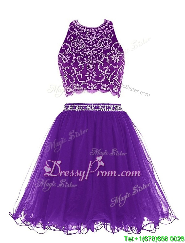 Neckline : ScoopShown Color : PurpleSilhouette : EmpireSleeve Length : sleevelessHemline : mini lengthBack Detail : Clasp handleFabric : ChiffonEmbellishment : BeadingOccasion : Prom,PartySeason : Spring,Summer,Fall
