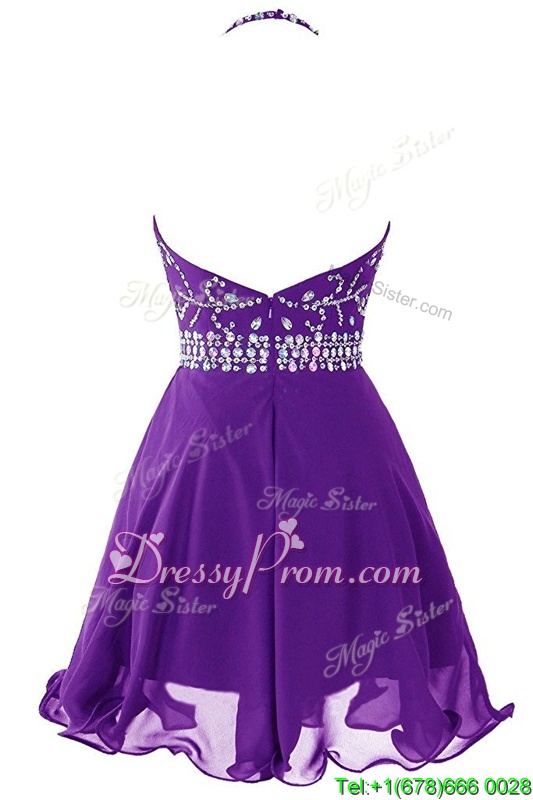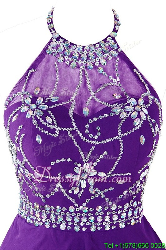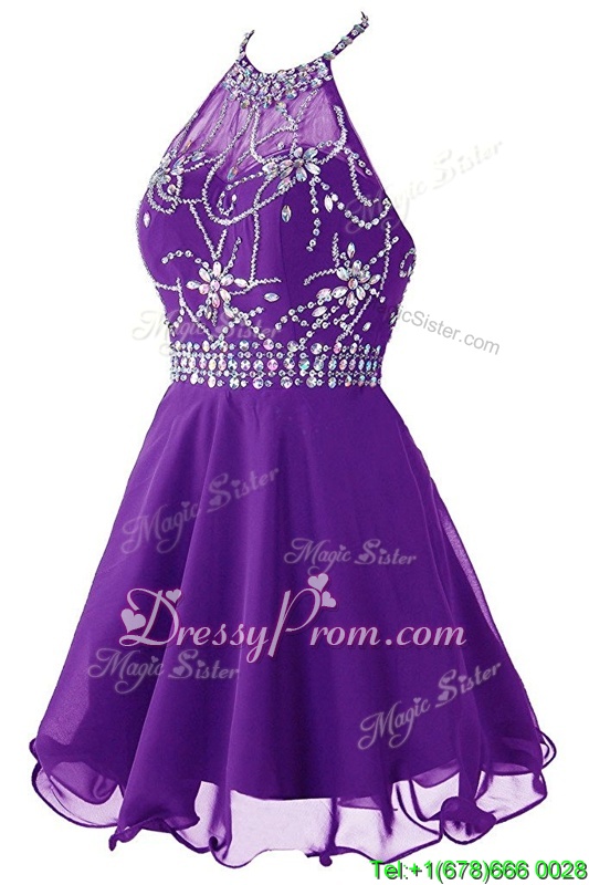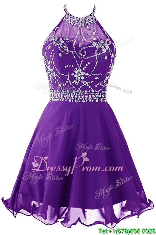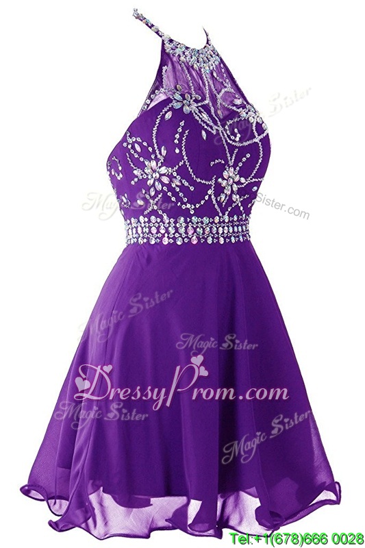 Eye-catching Halter Top Purple Zipper Prom Dress Beading Sleeveless Mini Length