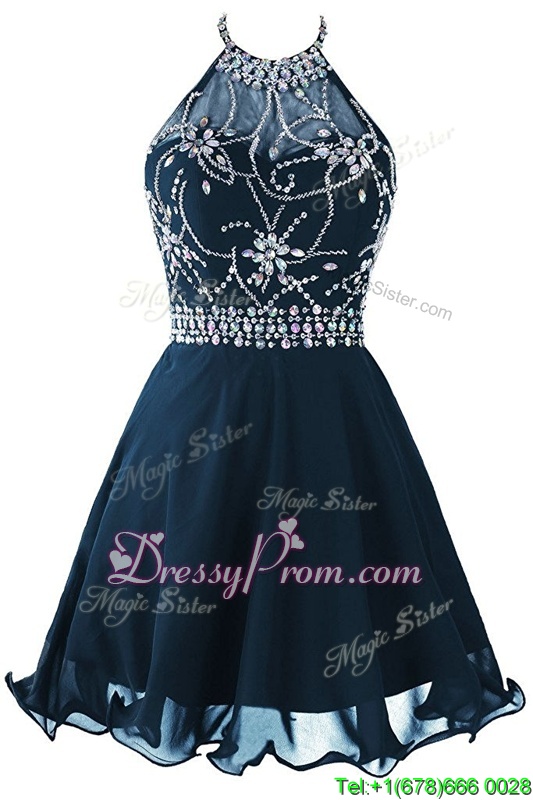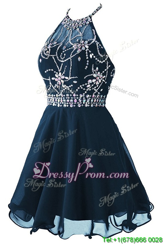 Neckline : ScoopShown Color : Navy BlueSilhouette : EmpireSleeve Length : sleevelessHemline : mini lengthBack Detail : ZipperFabric : OrganzaEmbellishment : Beading,BeltOccasion : Prom,PartySeason : Spring,Summer,Fall
