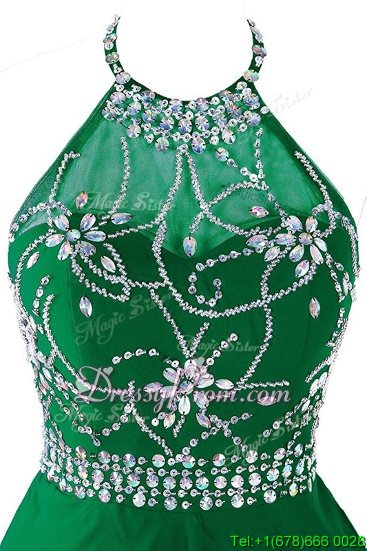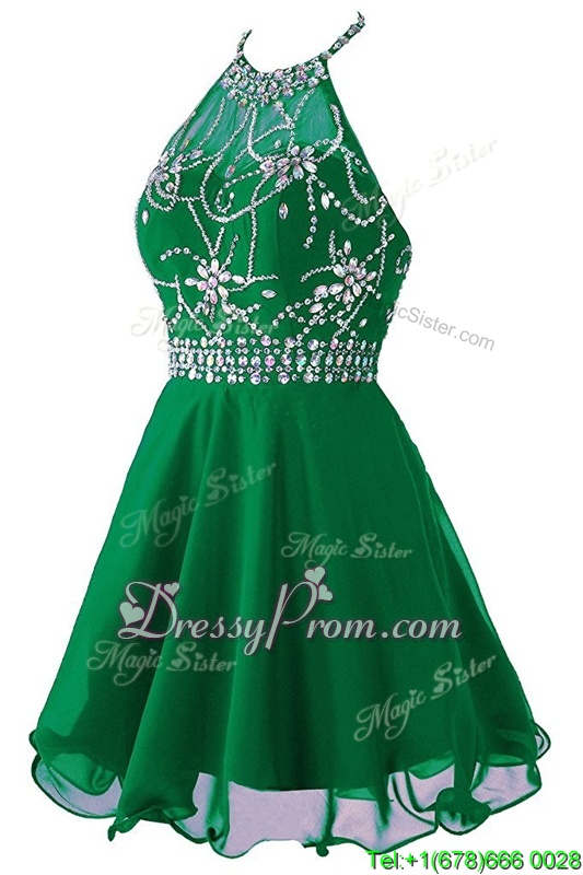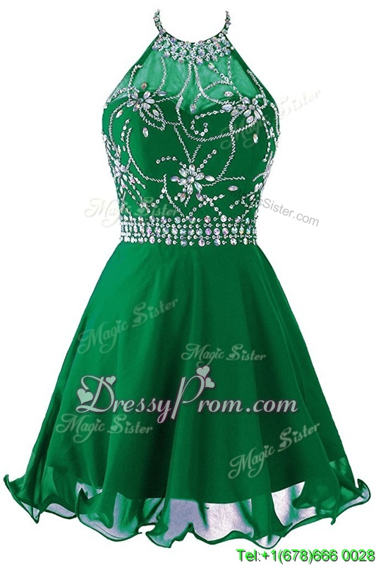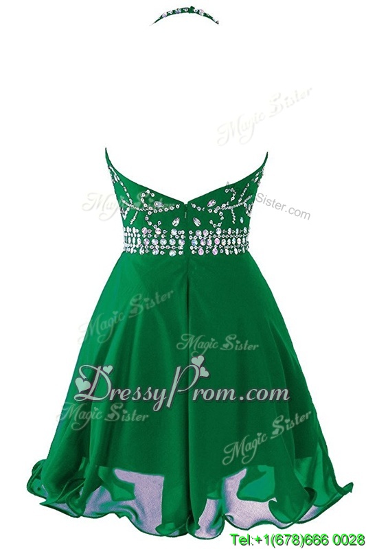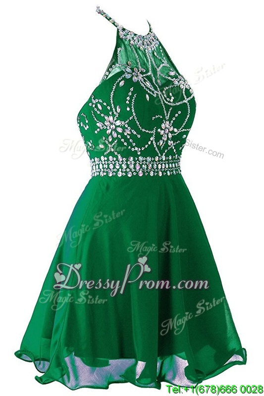 Neckline : ScoopShown Color : GreenSilhouette : EmpireSleeve Length : sleevelessHemline : mini lengthBack Detail : ZipperFabric : OrganzaEmbellishment : Beading,BeltOccasion : Prom,PartySeason : Spring,Summer,Fall