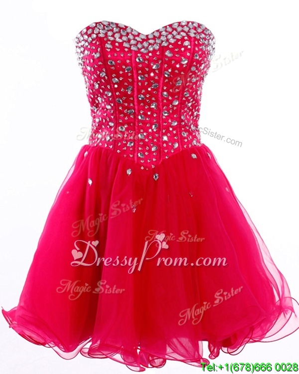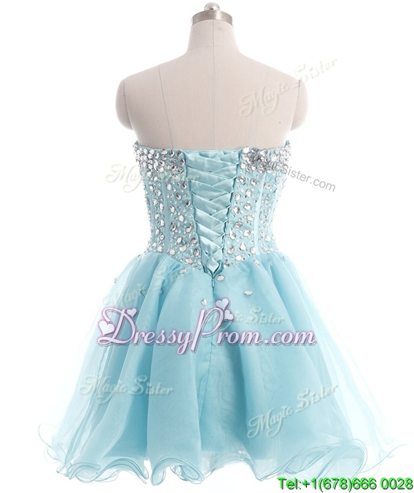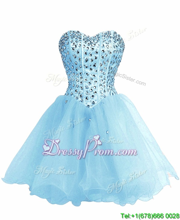 Neckline : SweetheartShown Color : Baby BlueSilhouette : Ball GownsSleeve Length : sleevelessHemline : mini lengthBack Detail : Lace upFabric : OrganzaEmbellishment : BeadingOccasion : Prom,PartySeason : Spring,Summer,Fall