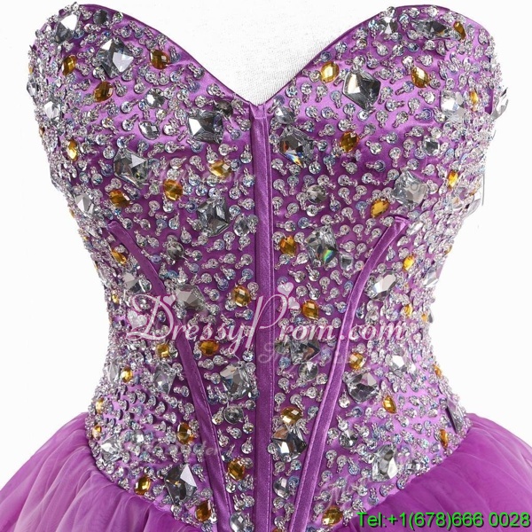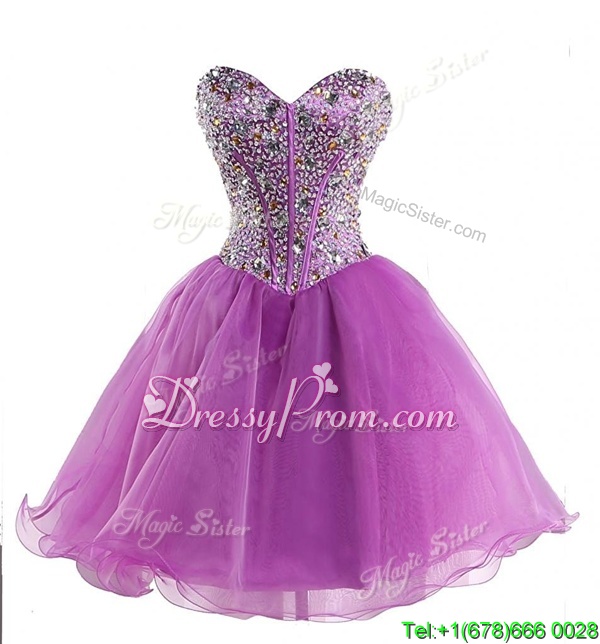 Neckline : SweetheartShown Color : LilacSilhouette : Ball GownsSleeve Length : sleevelessHemline : mini lengthBack Detail : Lace upFabric : OrganzaEmbellishment : BeadingOccasion : Prom,PartySeason : Spring,Summer,Fall