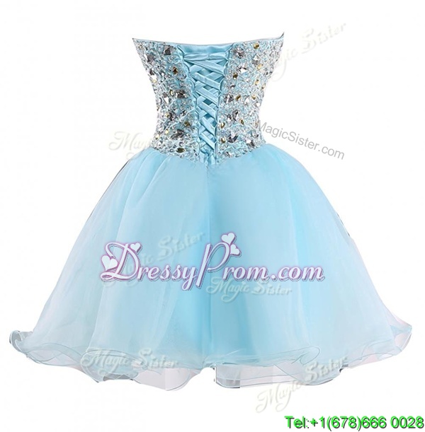 Neckline : SweetheartShown Color : Baby BlueSilhouette : Ball GownsSleeve Length : sleevelessHemline : mini lengthBack Detail : Lace upFabric : OrganzaEmbellishment : BeadingOccasion : Prom,PartySeason : Spring,Summer,Fall