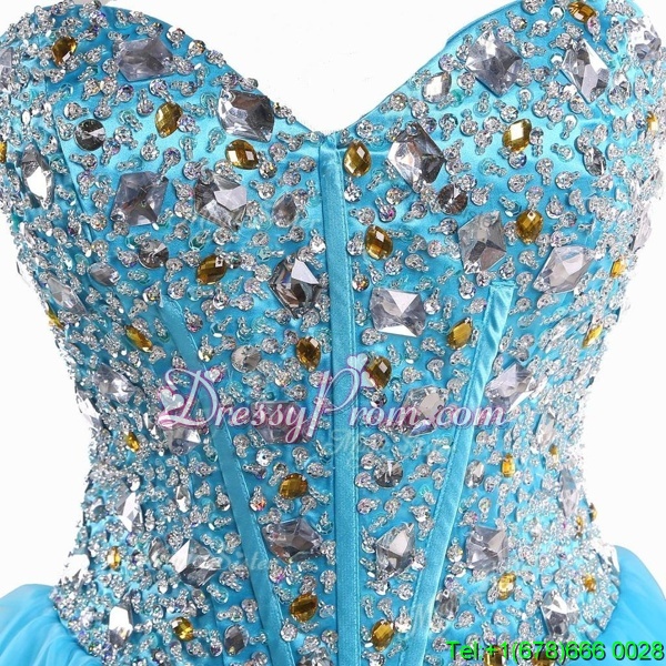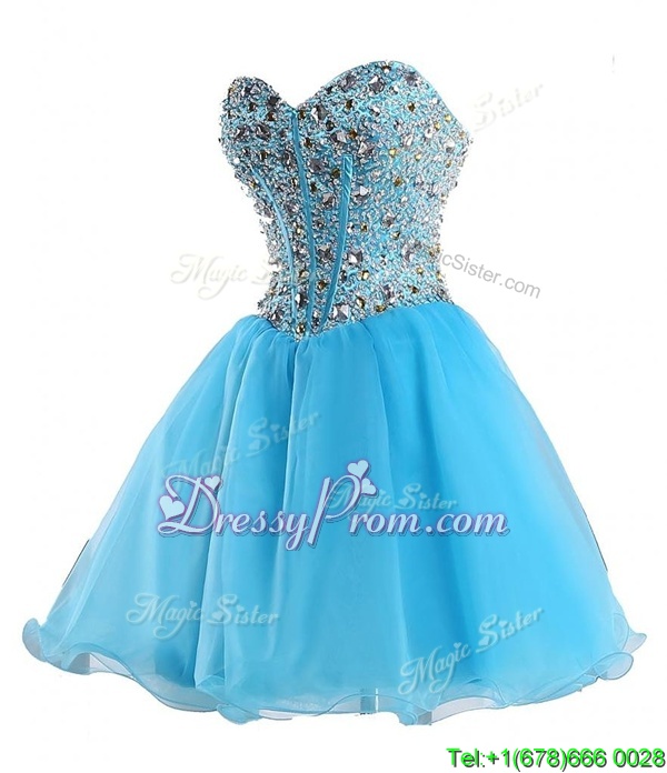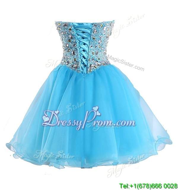 Neckline : SweetheartShown Color : BlueSilhouette : Ball GownsSleeve Length : sleevelessHemline : mini lengthBack Detail : Lace upFabric : OrganzaEmbellishment : BeadingOccasion : Prom,PartySeason : Spring,Summer,Fall