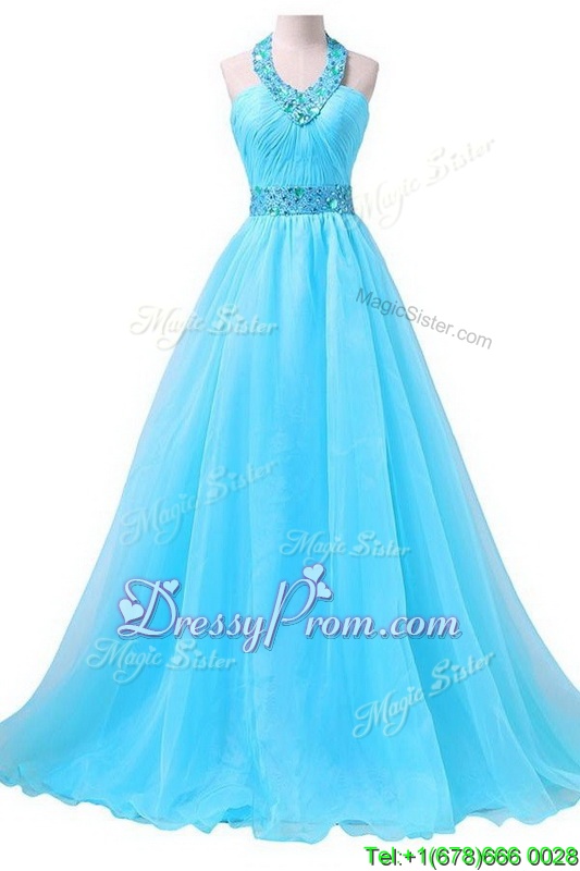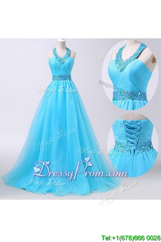 Neckline : Halter topShown Color : Aqua BlueSilhouette : Column/SheathSleeve Length : sleevelessHemline : floor lengthBack Detail : Lace upFabric : ChiffonEmbellishment : Beading,BeltOccasion : Prom,PartySeason : Spring,Summer,Fall,Winter