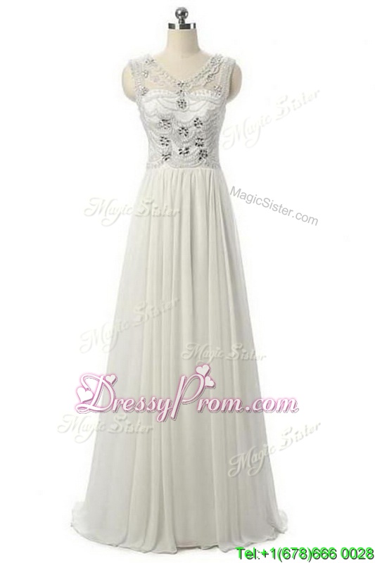Neckline : V-neckShown Color : WhiteSilhouette : Column/SheathSleeve Length : sleevelessHemline : floor lengthBack Detail : ZipperFabric : ChiffonEmbellishment : BeadingOccasion : PromSeason : Spring,Summer,Fall,Winter