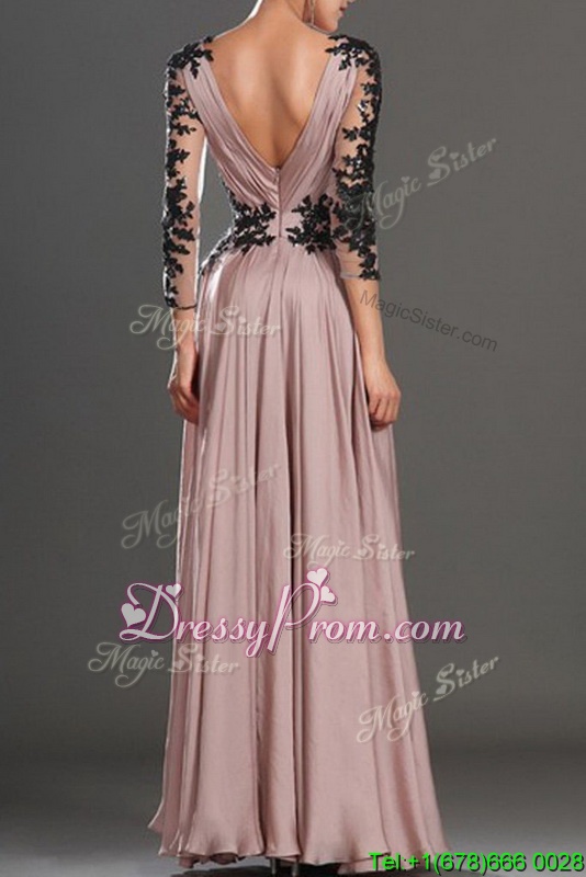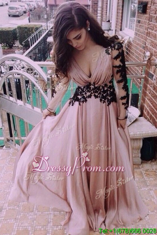 Neckline : V-neckShown Color : PinkSilhouette : Column/SheathSleeve Length : long sleevesHemline : floor lengthBack Detail : ZipperFabric : ChiffonEmbellishment : RuchingOccasion : Prom,PartySeason : Spring,Summer,Fall,Winter