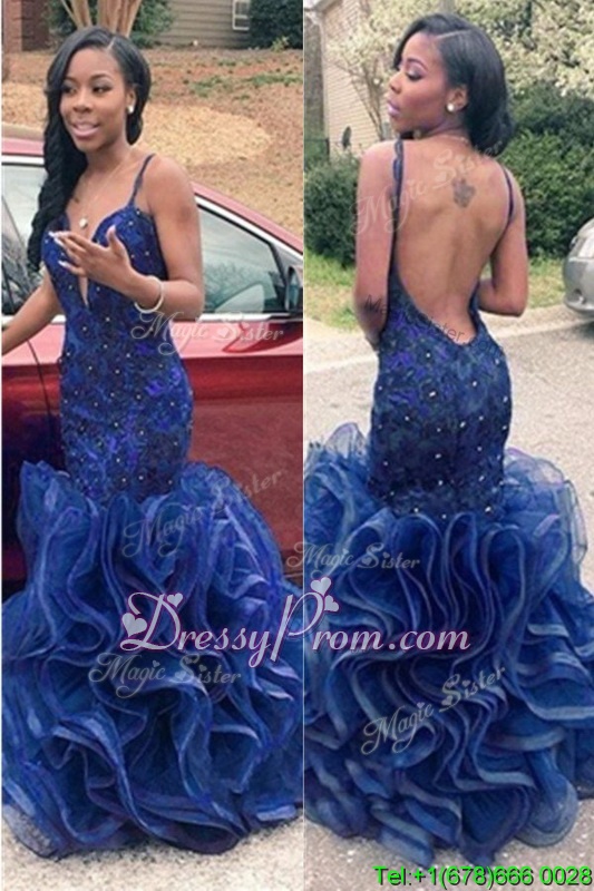 Neckline : Spaghetti strapsShown Color : Navy BlueSilhouette : MermaidSleeve Length : sleevelessHemline : floor lengthBack Detail : BacklessFabric : ChiffonEmbellishment : RufflesOccasion : Prom,PartySeason : Spring,Summer,Fall,Winter