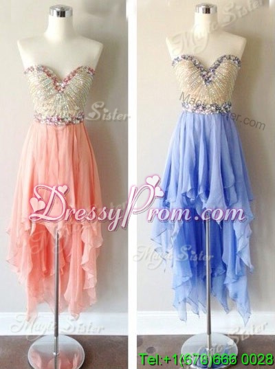 Neckline : SweetheartShown Color : Apple GreenSilhouette : A-lineSleeve Length : sleevelessHemline : high lowBack Detail : ZipperFabric : ChiffonEmbellishment : BeadingOccasion : Prom,PartySeason : Spring,Summer,Fall
