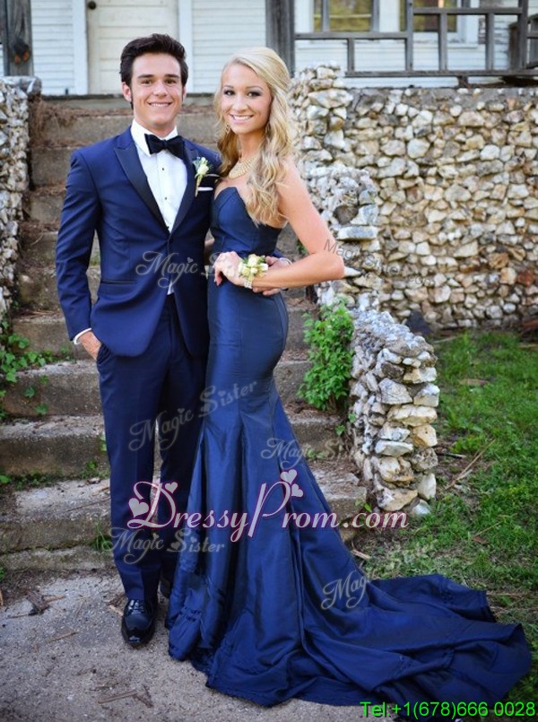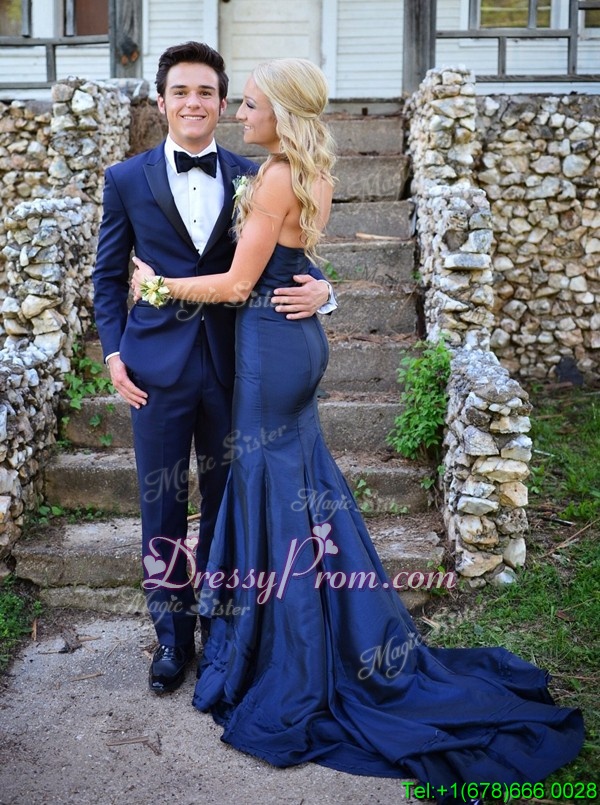 Neckline : SweetheartShown Color : Navy BlueSilhouette : MermaidSleeve Length : sleevelessBack Detail : ZipperFabric : ChiffonEmbellishment : RuchingOccasion : Prom,PartySeason : Spring,Summer,Fall