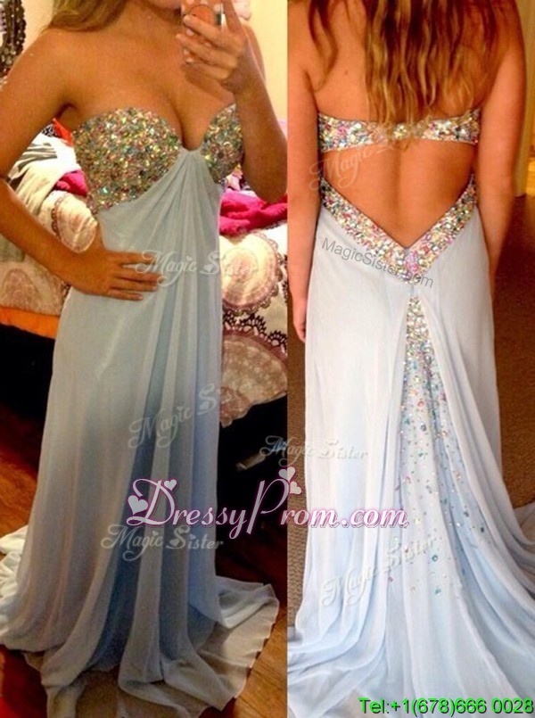 Neckline : SweetheartShown Color : Light BlueSilhouette : A-lineSleeve Length : sleevelessBack Detail : BacklessFabric : ChiffonEmbellishment : BeadingOccasion : Prom,PartySeason : Spring,Summer,Fall