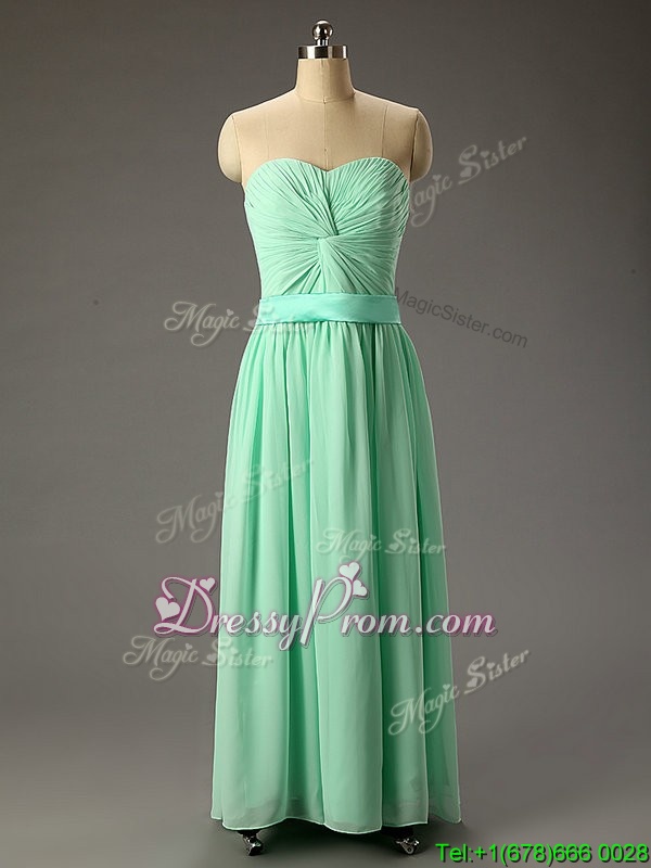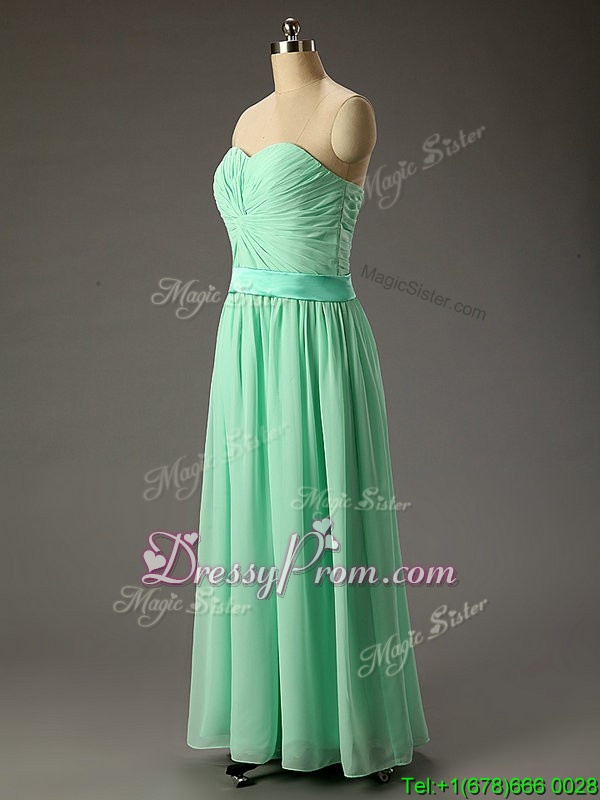 Neckline : SweetheartShown Color : Apple GreenSilhouette : A-lineSleeve Length : sleevelessHemline : floor lengthBack Detail : Lace upFabric : ChiffonEmbellishment : RuchingOccasion : Prom,PartySeason : Spring,Summer,Fall