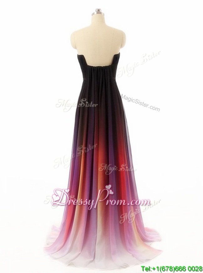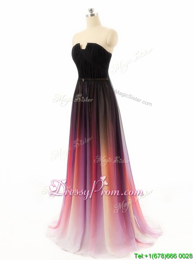 Neckline : StraplessShown Color : Multi-colorSilhouette : A-lineSleeve Length : sleevelessHemline : with trainBack Detail : ZipperFabric : Chiffon,Fading ColorEmbellishment : BeltOccasion : Prom,PartySeason : Spring,Summer,Fall