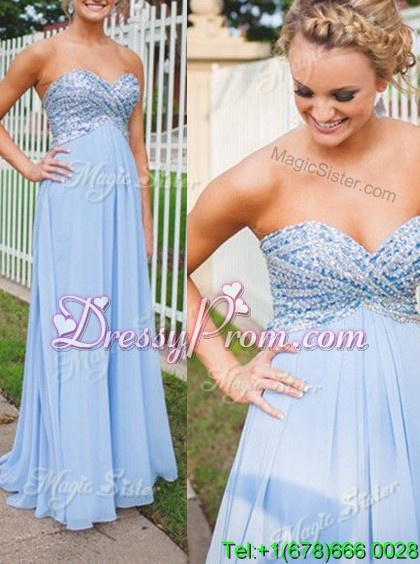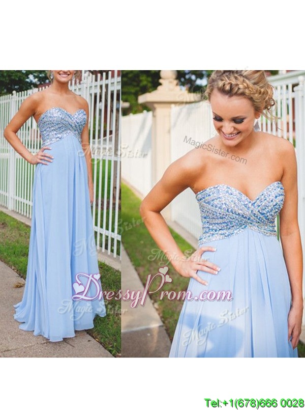 Neckline : SweetheartShown Color : Light BlueSilhouette : EmpireSleeve Length : sleevelessHemline : floor lengthBack Detail : BacklessFabric : ChiffonEmbellishment : BeadingOccasion : Prom,PartySeason : Spring,Summer,Fall