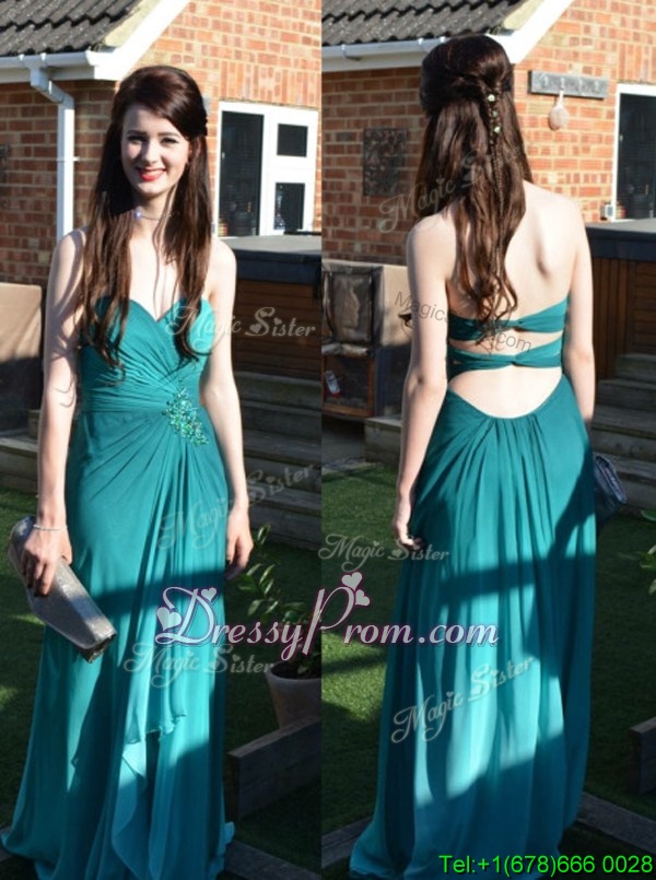 Neckline : SweetheartShown Color : Teal Silhouette : EmpireSleeve Length : sleevelessHemline : floor lengthBack Detail : BacklessFabric : ChiffonEmbellishment : RuchingOccasion : Prom,PartySeason : Spring,Summer,Fall