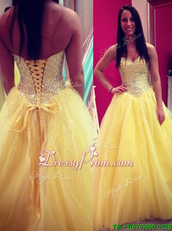 Neckline : SweetheartShown Color : YellowSilhouette : A-lineSleeve Length : sleevelessHemline : floor lengthBack Detail : Lace upFabric : ChiffonEmbellishment : SequinsOccasion : Prom,PartySeason : Spring,Summer,Fall