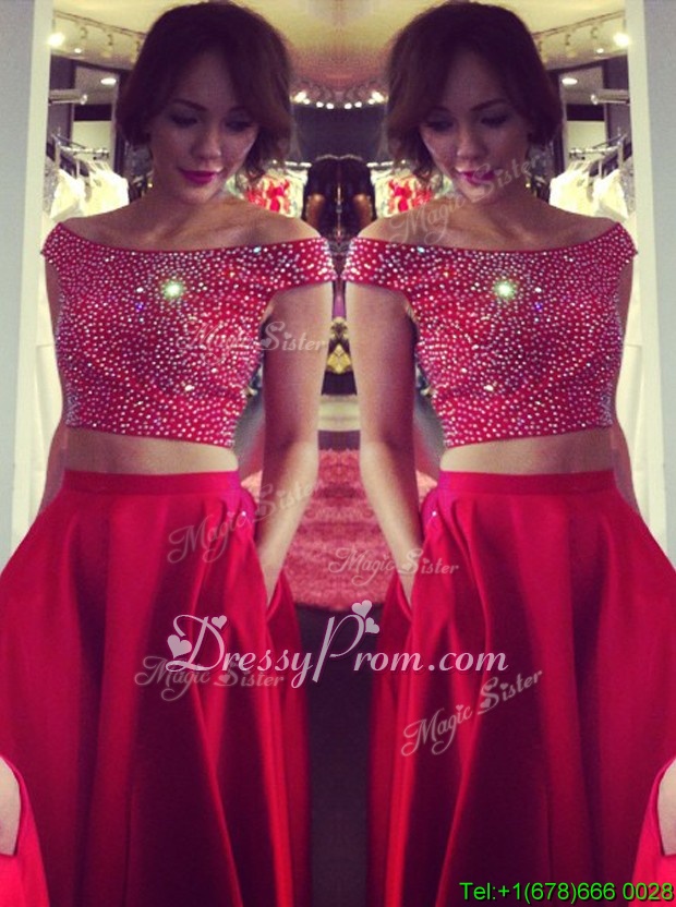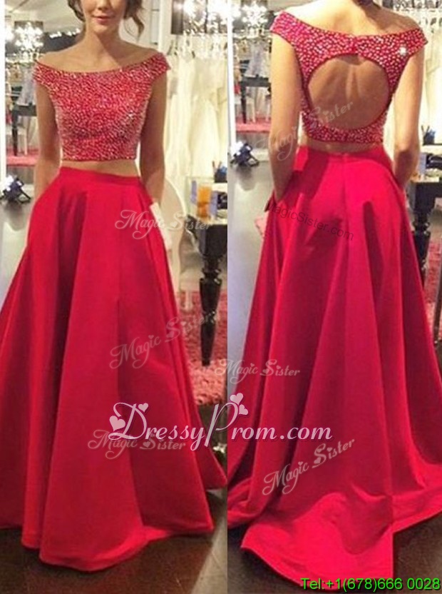 Neckline : Off the shoulderShown Color : RedSilhouette : A-lineSleeve Length : sleevelessHemline : with trainBack Detail : BacklessFabric : SatinEmbellishment : BeadingOccasion : Prom,PartySeason : Spring,Summer,Fall