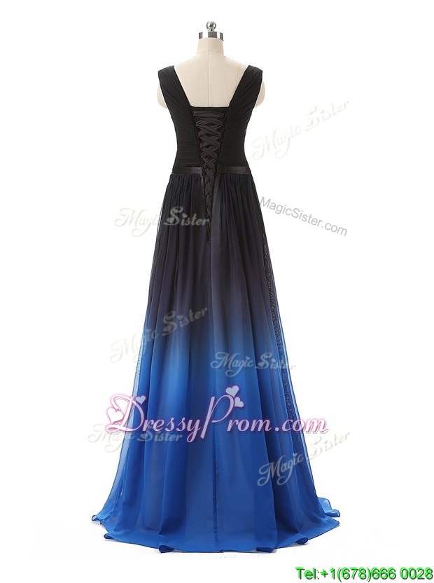 Neckline : V-neckShown Color : Blue And BlackSilhouette : A-lineSleeve Length : sleevelessHemline : floor lengthBack Detail : ZipperFabric : Chiffon,TulleEmbellishment : BeltOccasion : Prom,PartySeason : Spring,Summer,Fall