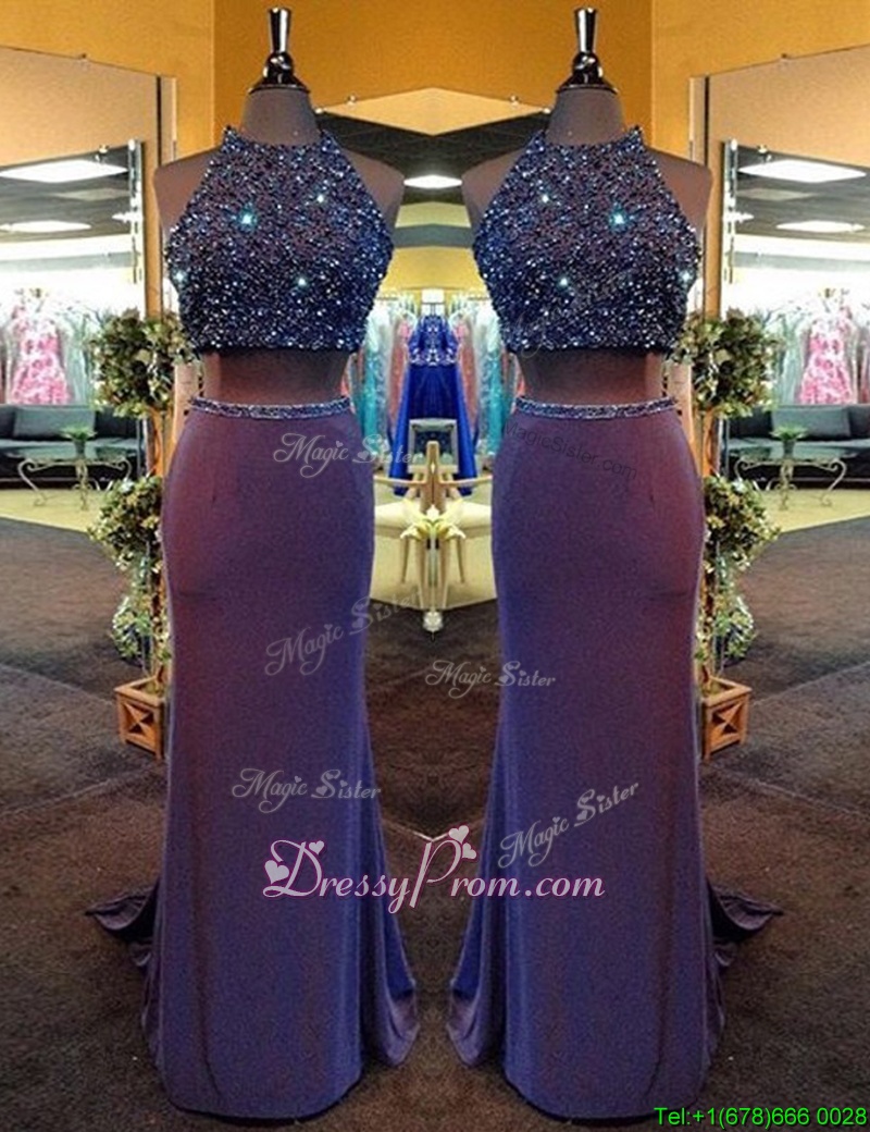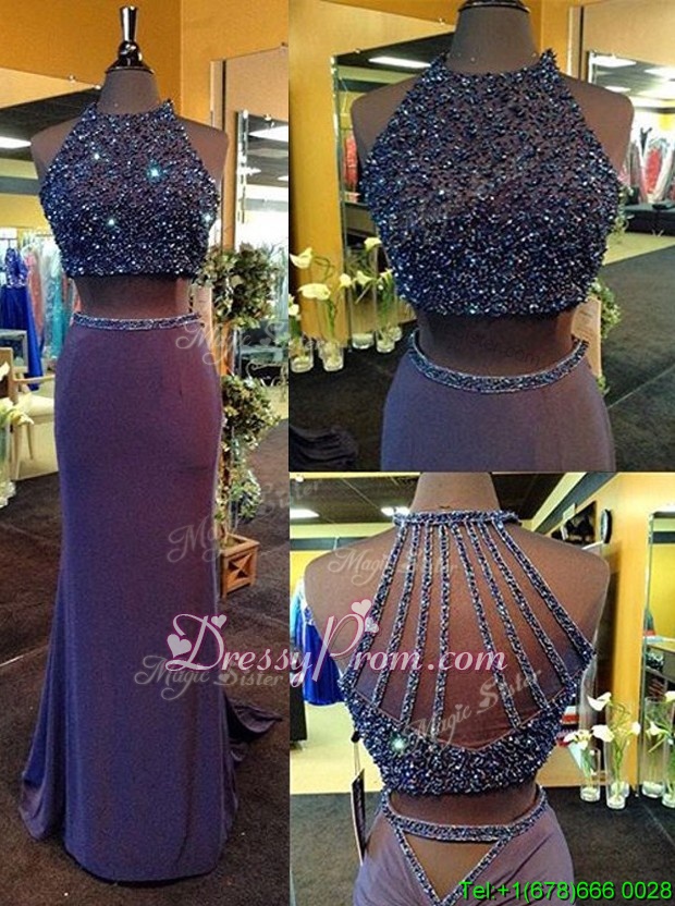 Neckline : High-neckShown Color : PurpleSilhouette : Column/SheathSleeve Length : sleevelessHemline : floor lengthBack Detail : Criss crossFabric : ChiffonEmbellishment : BeadingOccasion : Prom,PartySeason : Spring,Summer,Fall