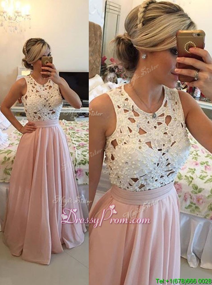 Neckline : ScoopShown Color : Baby PinkSilhouette : A-lineSleeve Length : sleevelessHemline : floor lengthBack Detail : ZipperFabric : ChiffonEmbellishment : BeadingOccasion : Prom,PartySeason : Spring,Summer,Fall