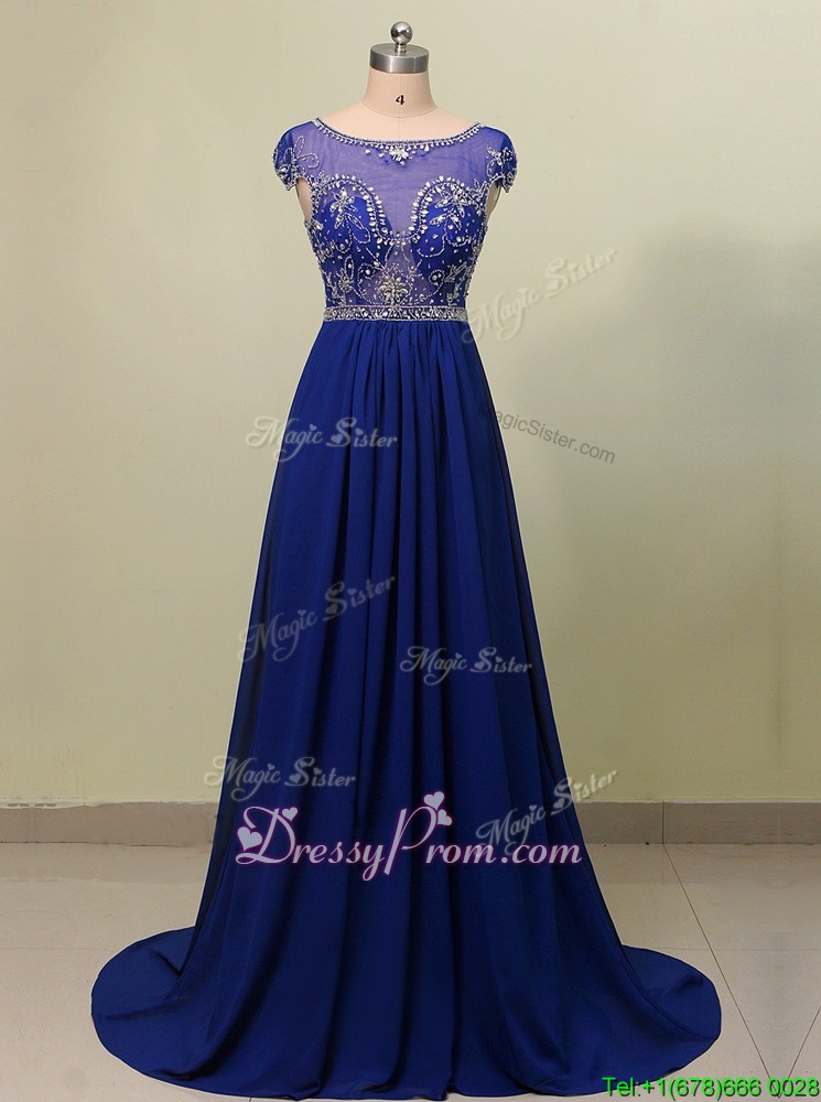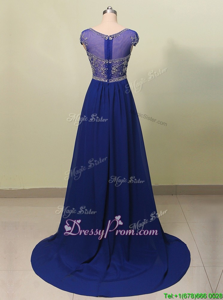 Neckline : ScoopShown Color : Royal BlueSilhouette : A-lineSleeve Length : cap sleevesHemline : with trainBack Detail : ZipperFabric : ChiffonEmbellishment : BeadingOccasion : Prom,PartySeason : Spring,Summer,Fall