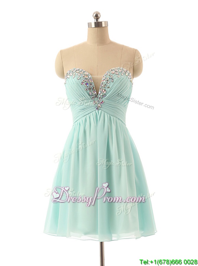 Neckline : SweetheartShown Color : Light BlueSilhouette : A-lineSleeve Length : sleevelessHemline : knee lengthBack Detail : ZipperFabric : ChiffonEmbellishment : BeadingOccasion : PartySeason : Spring,Summer