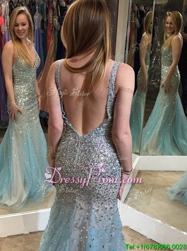 Neckline : V-neckShown Color : Multi-colorSilhouette : MermaidSleeve Length : sleevelessHemline : floor lengthBack Detail : BacklessFabric : TulleEmbellishment : BeadingOccasion : Prom,PartySeason : Spring,Summer,Fall